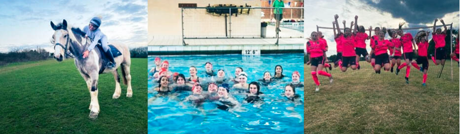 Basketball, Badminton, Athletics, Gym workouts, Swimming, Running, Walking, Horse Riding, Hip Hop Dance, Football, Trampolining, Judo, Tae Kwon Do, Mermaid Swimming, Team Sports at Fire Cadets, and Street Dance.