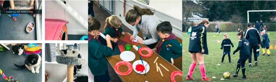 Helping at Guides/Scouts/Brownies/Cubs/Rainbows/Beavers packs, volunteering in local libraries, volunteering in local charity shops, helping at various sports clubs, helping at after school clubs, volunteering with Riding for the Disabled, helping at clubs within school including Netball and Dance, running own clubs within school including British Sign Language Club, Junior Steel Pan Band, and Multi Sports Club, giving instrumental lessons to other students, and volunteering at Parkrun.